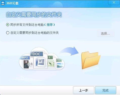 設(shè)置后,系統(tǒng)會讓您設(shè)置需要同步所有文件或自定義文件,我們一般選同步所有文件到這臺電腦。