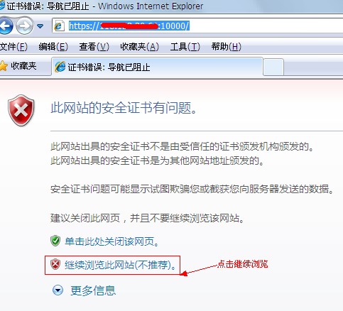1、首先我們打開瀏覽器輸入地址,如:https://域名:10000 ,瀏覽器可能會(huì)顯示證書錯(cuò)誤,點(diǎn)繼續(xù)瀏覽網(wǎng)站,如圖: