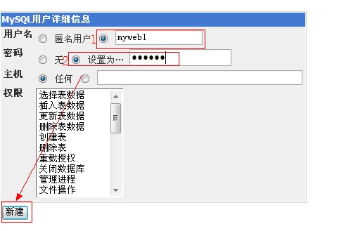 e、輸入用戶名、密碼,主機(jī)選擇“任何”,點(diǎn)擊新建。如圖: