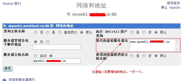 e、在替代的虛擬服務(wù)器名填寫您的域名,一行一個(gè)。然后點(diǎn)保存,如圖: