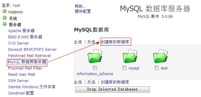 6、最后是建立數(shù)據(jù)庫了: a、點(diǎn)擊左側(cè)的“服務(wù)器”—“mysql數(shù)據(jù)庫服務(wù)器”,然后點(diǎn)擊右側(cè)的“創(chuàng)建新的數(shù)據(jù)庫”如圖: