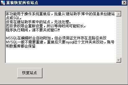 3、點擊提示對話框,會自動打開“網站管理助手”,點擊“系統設置”--“重裝恢復”,系統會自動重建用戶賬戶、IIS站點、FTP和mysql。重建成功后會有相應提示。