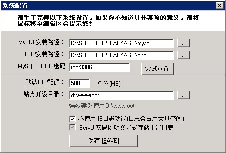 網(wǎng)站管理助手v3.0 建站流程首次運行網(wǎng)站管理助手,會彈出“系統(tǒng)配置”窗口,一般情況下只需要檢查站點開設目錄是否存在,如果不存在, 請先手工建立目錄。強烈建議保持我司的默認配置環(huán)境,不要修改mysql、php的安裝路徑,建議使用我司 推薦的D:\wwwroot目錄作為網(wǎng)站目錄,出現(xiàn)問題時方便核查原因。如圖: