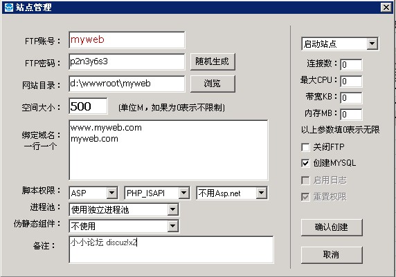 FTP賬 號:填寫一個FTP賬號,可以是英文(建議小寫)和數(shù)字的組合 FTP密 碼:建議保持默認或自己設定一個容易記住但比較復雜的密碼,切勿用FTP賬號做密碼。 網(wǎng)站目錄:建議保持默認設置 空間大小:建議保持默認設置 綁定域名:一行填寫一個,一般填寫www的和不加www的頂級域名。 腳本權限:如果是asp程序,請將php_isapi修改為“無”; 如果是PHP程序,請將ASP修改為“無”; 如果是ASP.NET程序,請將ASP修改為“無”,請將PHP_ISAPI修改為“無”,請將“不使用asp.net”修改為 您需要的版本,如asp.net2.0 。 如果您對腳本權限概念不熟悉,請保持默認設置。 進程池:建議保持默認設置 偽靜態(tài)組件:PHP程序請在下拉菜單選擇對應規(guī)則,如果沒有找到對應的,請選擇自定義,保存配置后進入您站點的 others目錄下,修改httpd.conf中的規(guī)則即可。ASP和ASP.NET程序建議保持默認設置(不使用) 備注:可以備注站點名稱,或者裝的什么程序,比如discuz,方便管理。也可以保持默認