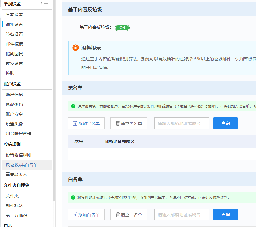 功能路徑:郵箱設置 – 收信規則 – 反垃圾/黑白名單 – 基于內容反垃圾操作